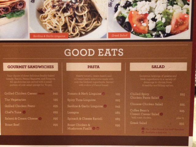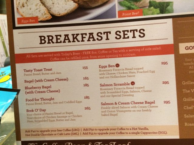 カフェラテとサンドウィッチがセットで135ペソ。平日だと99ペソでお値打ち。