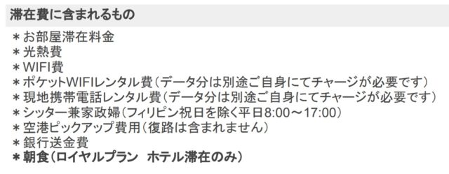 ここで注意すべき点として、滞在費には以下のみが含まれているとのこと。