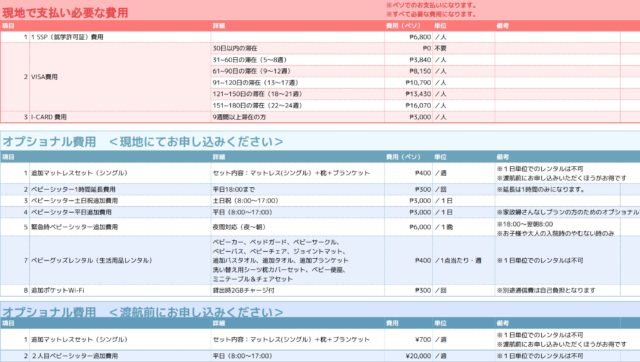 Kredo Kidsが提供するスタンダードプランのコンドミニアム、Solinesの滞在費はこうなってました。