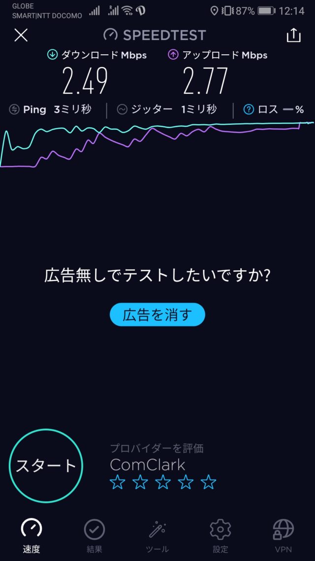 速度: Download: 2.49Mbps、Upload: 2.77Mbps