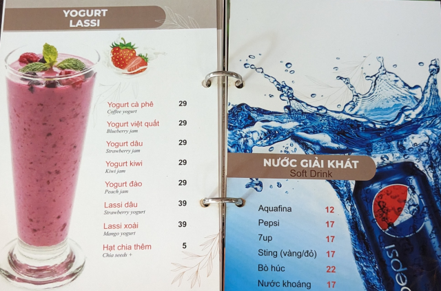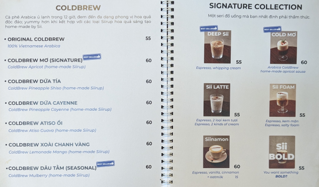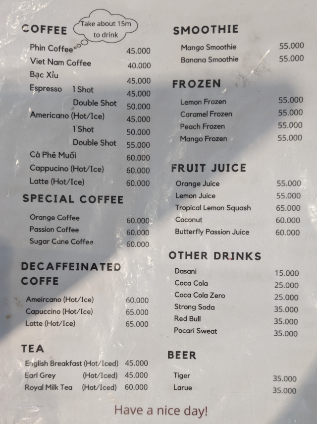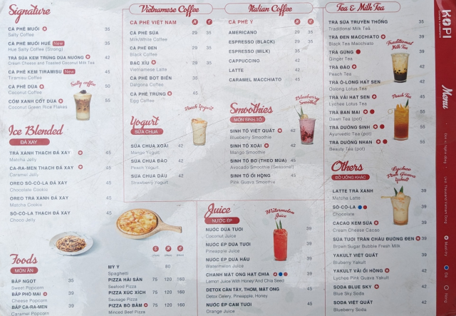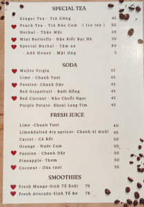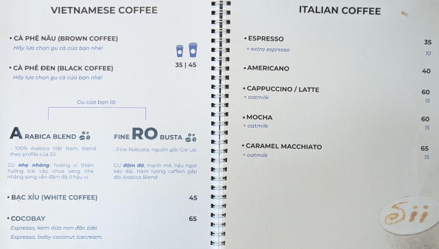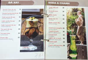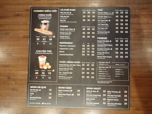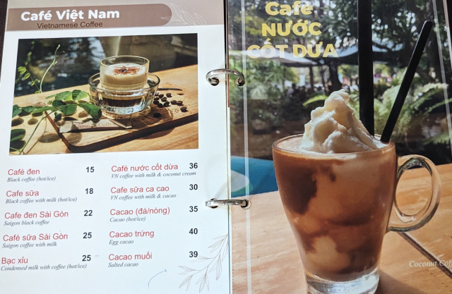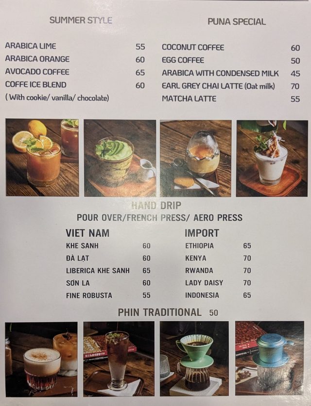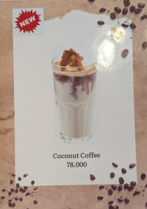 メニュー表の価格は間違ってて、塩コーヒー(cà phê muối)とココナッツコーヒー(Cà phê dừa)とが入れ替わってます。