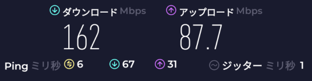 速度: Download: 162Mbps、Upload: 87.7Mbps