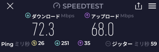速度: Download: 72.3Mbps、Upload: 68.0Mbps