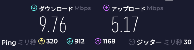 速度:         Download: 9.76Mbps、Upload: 5.17Mbps