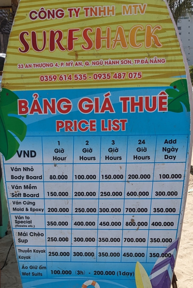 ちなみに、ミーケビーチにあるサーフィンのレンタル料金はこうなってました。