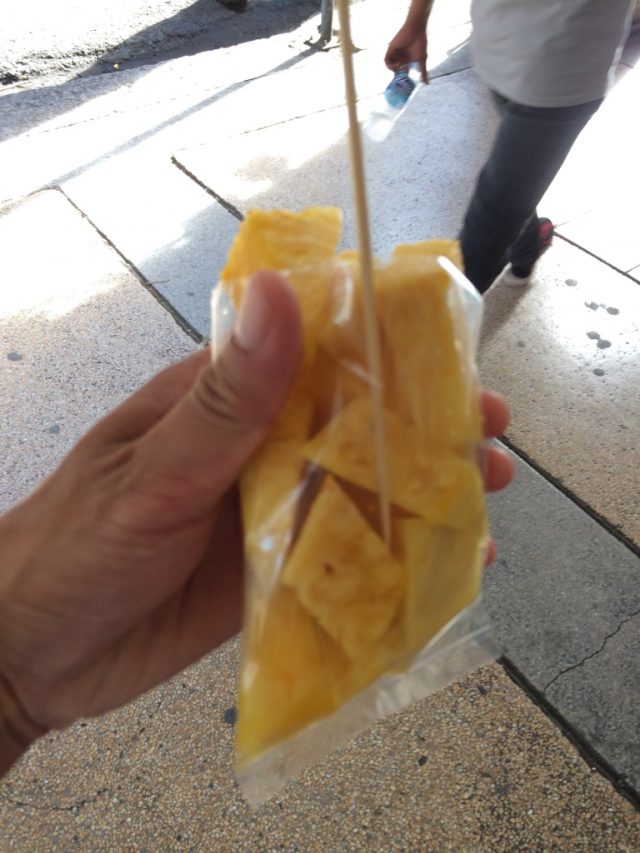 パイナップルやパパイヤといった南国のフルーツが切り売りされていて、いつでもフルーツ補給できます。