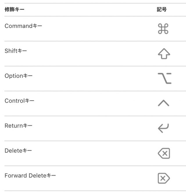 ちなみに、上記Macのショートカットキーの記号はこの通りです。