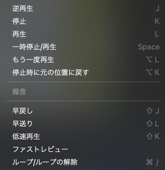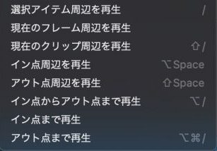 メニューにある「再生」と「マーク」のショートカットキー一覧のスクリーンショットをここに張っておくので参考にどうぞ。