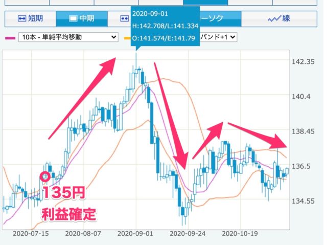 135円前後で利益確定した直後、ポンド円は高騰。