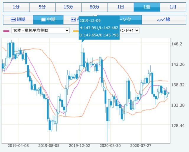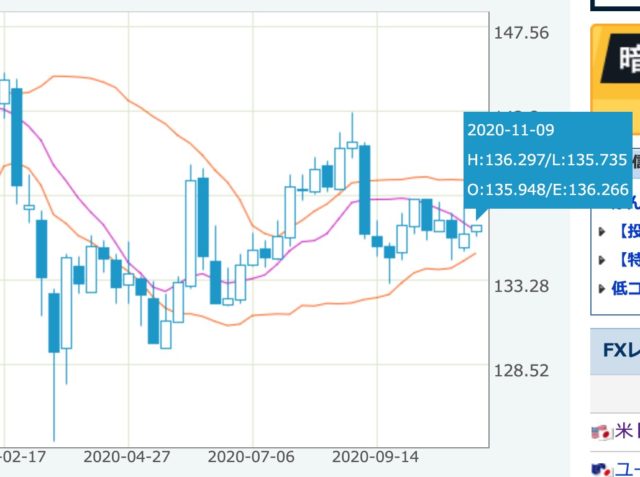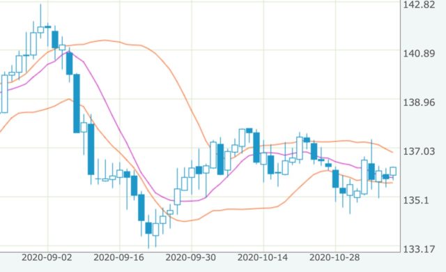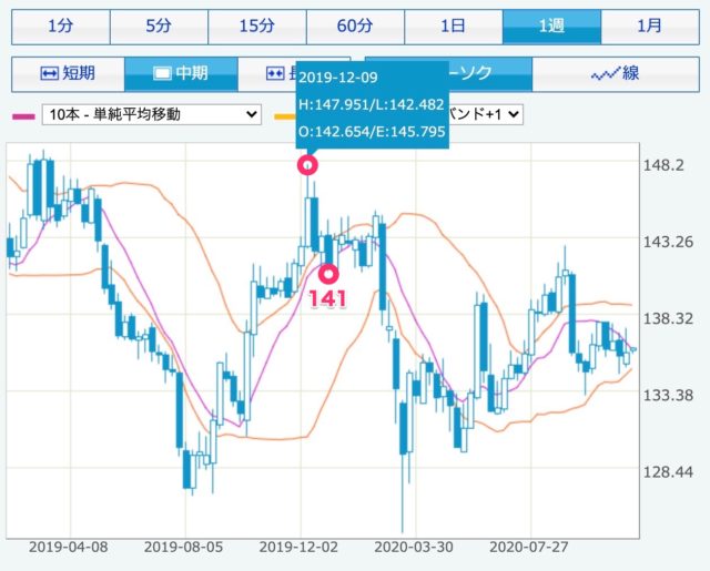 9月の暴落から回復後、コロナショック前の144円まで高騰することもなく横横の展開が2ヵ月間以上にわたって続いている状況です。