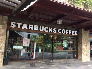 ここのスターバックスはいつも混んでます。外は暑いですがここなら座れることが多いです。