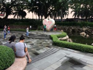 そのカフェが立ち並んでいる前が大きな中庭となっていて、池とハートのオブジェの前で絶えず写真撮ってます。