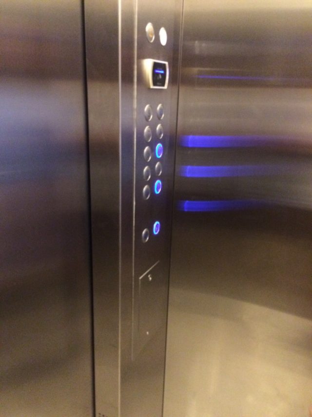 このエレベーター、カードをかざしてから行き先ボタンを押すタイプの最新式。