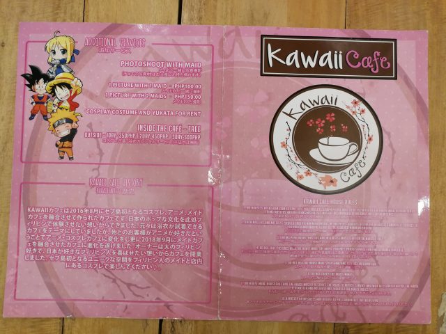 日本の伝統文化やサブカルチャーをもっと身近に感じることのできる場所を提供しよう、というコンセプトのもとセブ島にオープンしたカフェだそう。日本人経営。2016年8月にすでにオープンしていて、2年後の2018年9月、このJセンターモールに移転してきたとのこと。その旨メニューにも書かれてます。