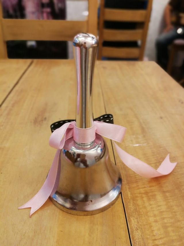 スタッフとの会話も厳禁のようで、スタッフを呼ぶさいはテーブルに置かれてるこのベルを鳴らします。