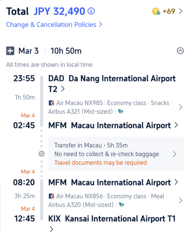 スカイスキャナーで検索して、コストと乗り換えのバランスが良い航空会社・便を選択。(マカオ航空)