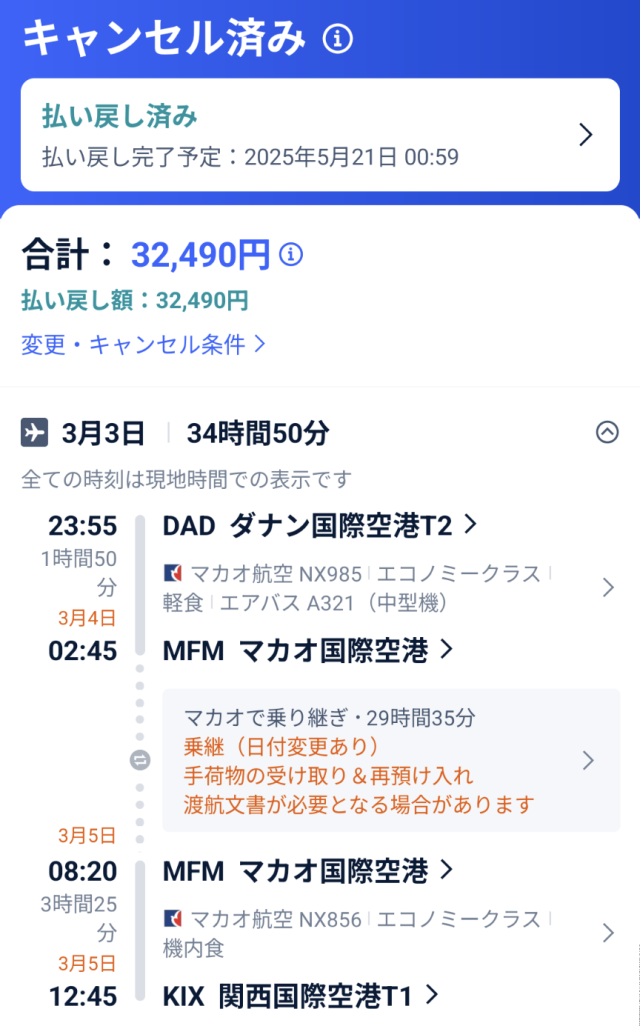 キャンセル 2025年3月(ダナン – 関空)(マカオ航空)