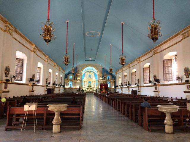教会の中は、水色の天井が印象的な綺麗な作り。ラワグに訪れたなら必見ですね。