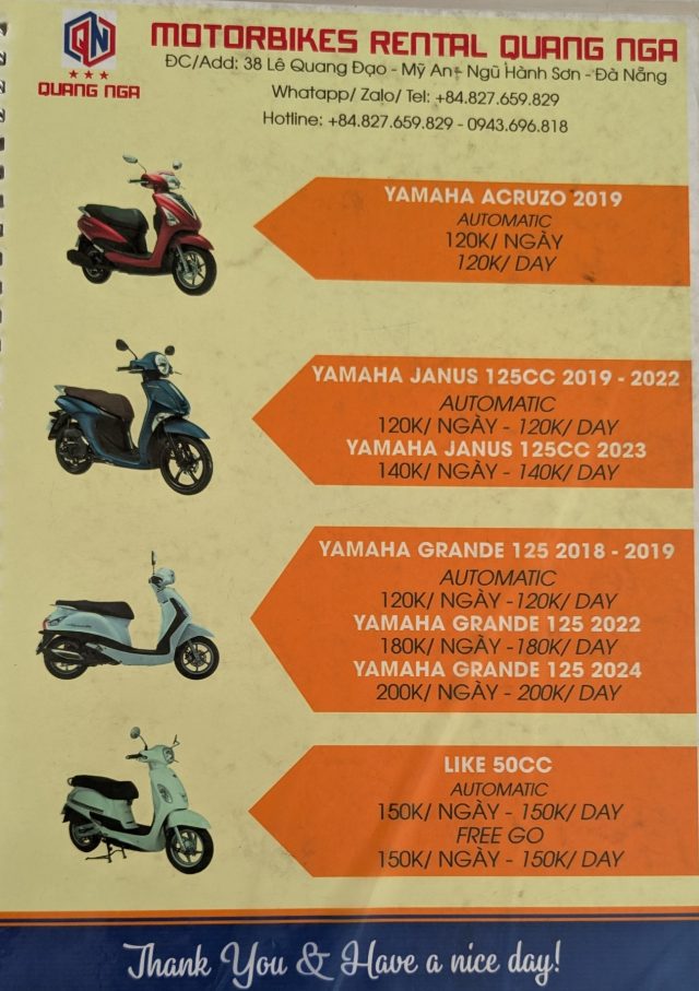 街中にあるバイクレンタルの料金はスクーターが1日100K VND 〜 150K VND です。
