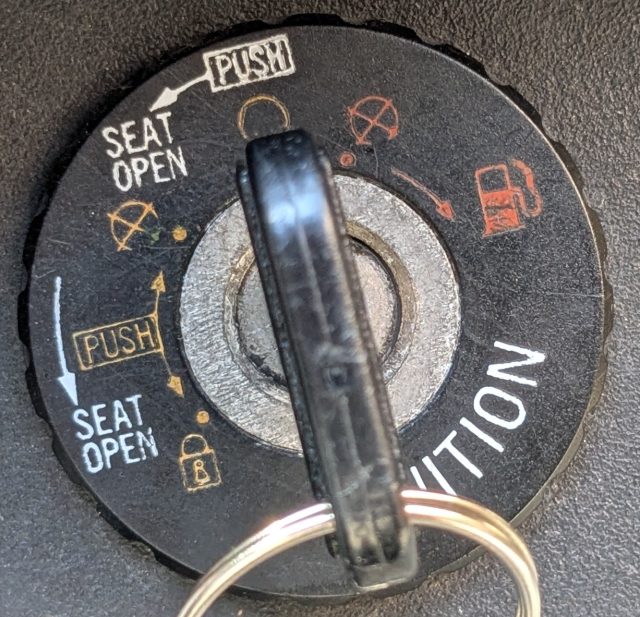 キーを左に回すとシートオープン、右に回すとガソリンキャップオープン。