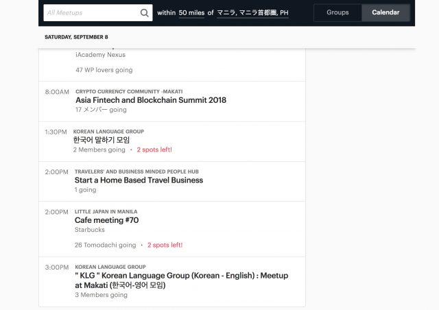 マニラで検索すると、かなりの数のグループが見つかります。