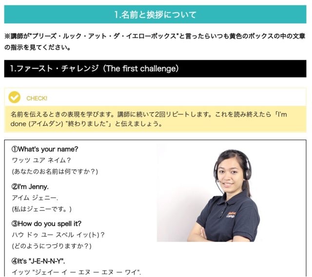 初心者コース1ではこういった基本的かつレッスンで実際何度も使う会話を習います。