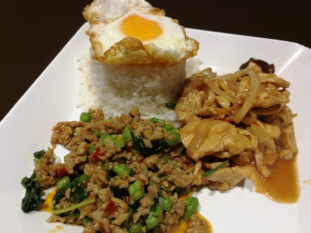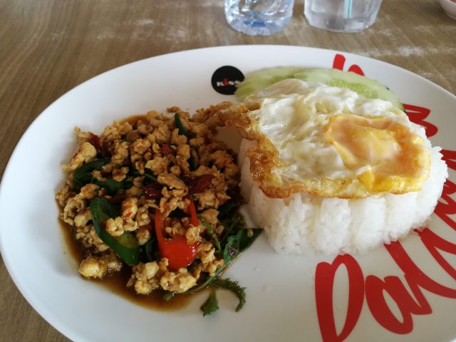 ガパオライスにもう一品つけたものが70Bぐらいです。