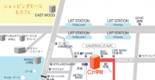 ホームページの学校紹介では、最寄駅のKatipunan駅のすぐ近くにEAST WOODというショッピングモールがあると書かれています。