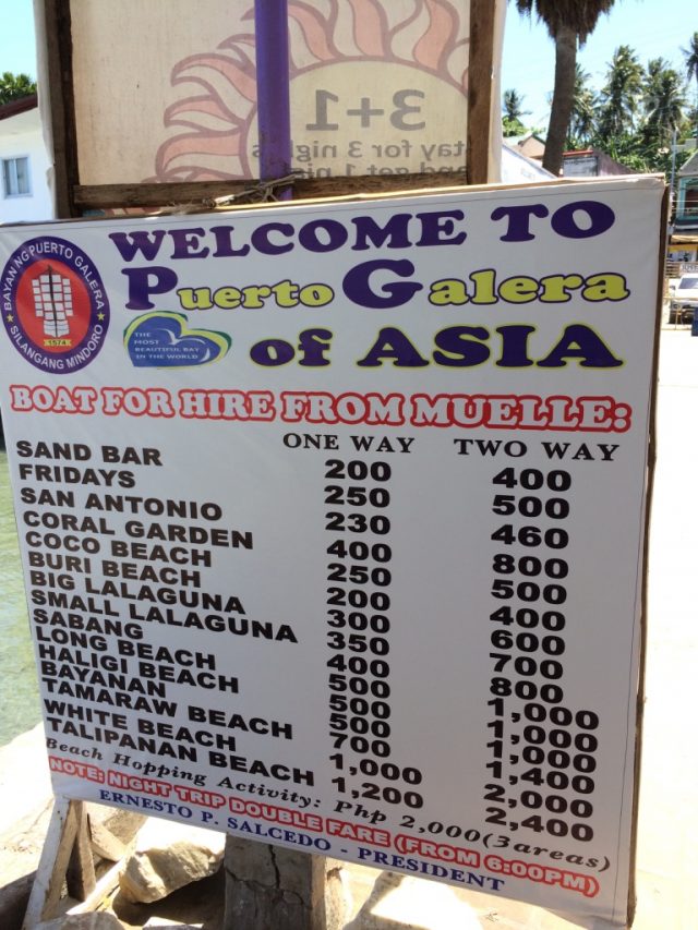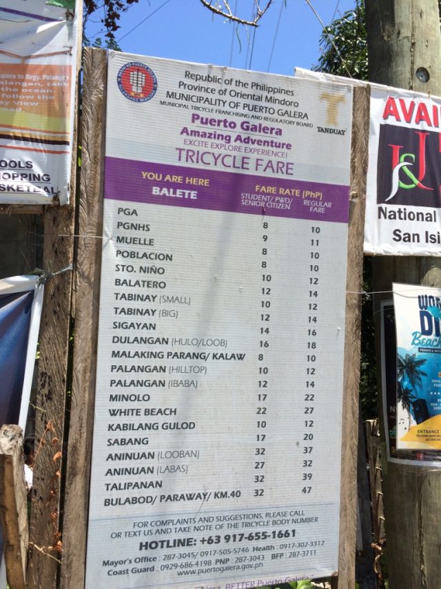 なお、トライシクルの料金ですが、ローカルの正規の価格が書かれてました。ここからホワイトビーチまで20ペソ。ジプニーと同じだそうです。ただ、実際は外国人には良心的で100ペソ、「How much?」と聞くと150ペソと返ってきます。はたしてこの20ペソで行くことができるのでしょうか?面倒なので試しませんが。