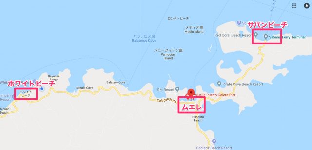 まず、プエルトガレラのサバンビーチ(Saban Beach)の位置を地図で確認します。