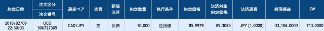 実は、1月中旬に89.3085円で1万通貨買いポジションをとっていて、今回の円高により逆指値に設定していた損切りが発生。