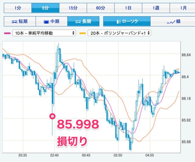 この半年では8月11日につけた85.472円が最安値。そこまで下がることはないだろうとたかをくくっていて、一応さしていた逆指値の位置が悪く、損切りしてしまいました。