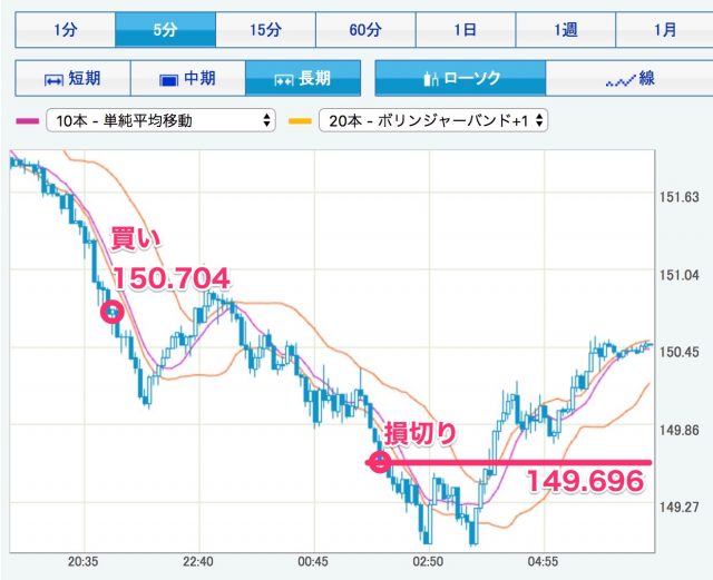 150円代まで下がったので買いでエントリーしたのは良かったのですが、エントリーのタイミングを焦りすぎて損切り発生。逆指値を設定してなければ0.3円程度の含み損ですんでいたのですが。もう一度買い戻すか悩むところです。