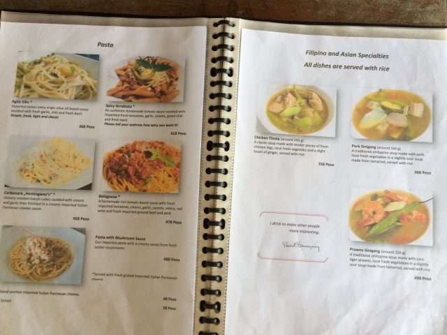 パスタでも400ペソしますし、ちょっとした料理でも500ペソ以上するものもたくさんあり。