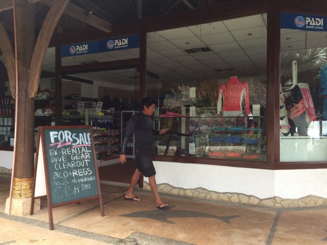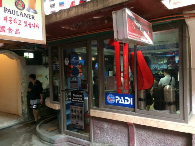 こういった路地裏にもダイバーショップがあります。荷物になるでしょうから、ダイビング用品は全部レンタルしてしまってもいいかと。