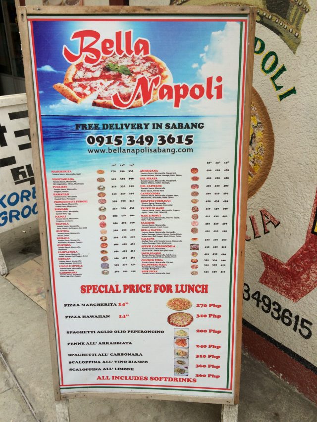 サバンビーチのビーチ沿いに比べればまだ安い方ですが、それでもピザで250ペソ。
