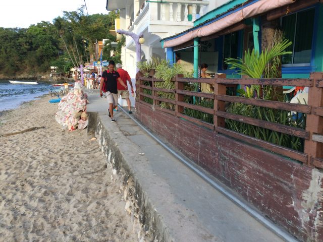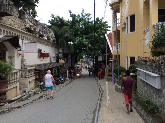 道は、サバンビーチ沿いに一本あるだけで、見ての通り狭いですし、ベンダー(物売り)やツアーガイドの売り込みもたくさんいるので、歩きづらい道です。