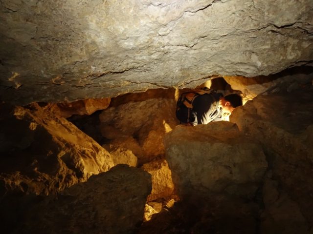 この小さな穴を、体をねじまげながら洞窟内部に入って行きます。