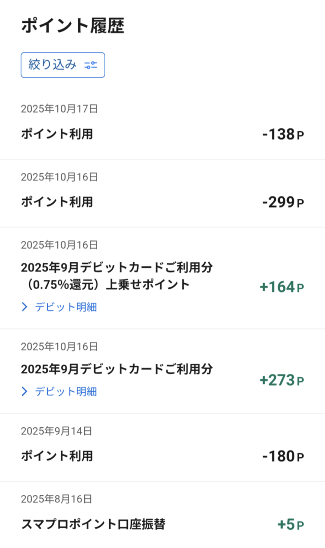 で、これ↓がデビットカードのポイント履歴です。