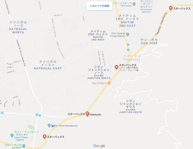 フィリピンの避暑地として有名な観光地、タガイタイ(Tagaytay)。そのタガイタイにもいくつかスターバックスがあります。場所はこちら。