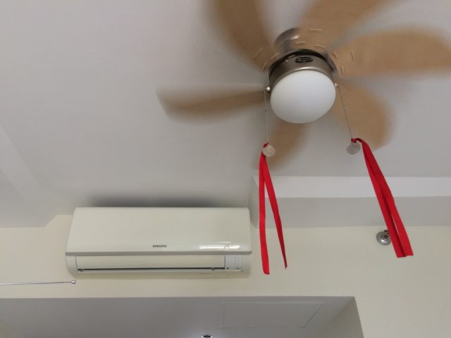 エアコンは長方形型のいいやつ。さらに、天井にはファンがあり。ただ、どっちもほとんど使ってません。
