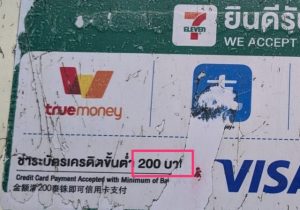 さらに、セブンイレブンでは「200バーツ以上から」、多くの店で「300バーツ以上から」といった最低利用制限があり、小銭が発生するローカルな現場では実質的に役に立たないのが現状です。