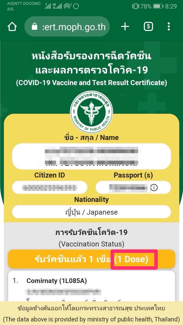 ただ、タイで接種するのは初めてなので、ワクチン接種状況は一回目になってました。