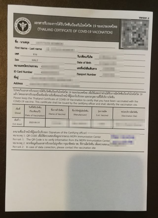 - 必要書類: 接種当日は、日本国籍のパスポートとワクチン接種記録(英語表記のある記録の原本、或いは日本語等の記録原本にタイ語乃至英語の仮訳書を添付する場合のみ有効)のほか、パスポートのコピー(署名と電話番号の記載のあるもの1部)、ワクチン接種証明書のコピー1部をご持参ください。