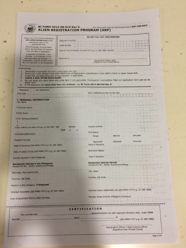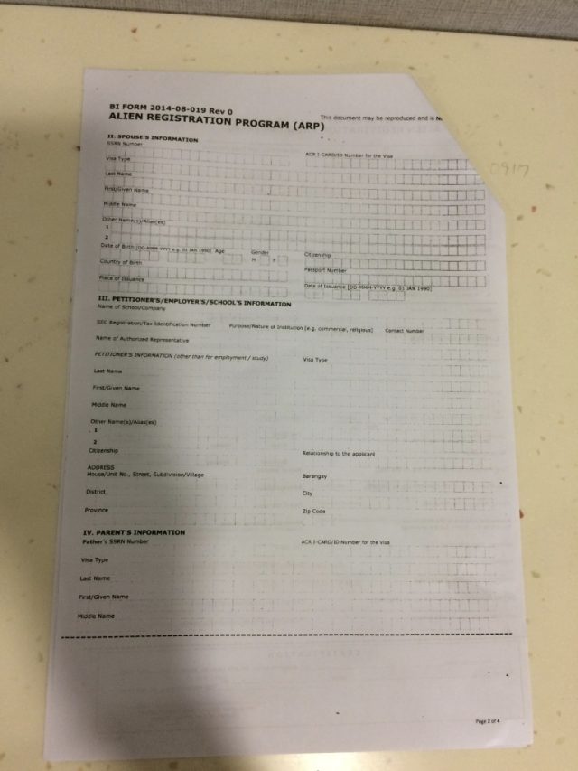 ただ、移民局の担当者に間違った情報、「ACR Iカードの表裏のコピーも必要」と言われていたので、その分余計に合計22ペソ払いました。(6ペソ3枚の内訳は、ACR Iカードの表、表のコピーと裏を2部)