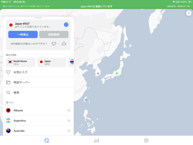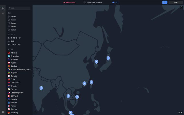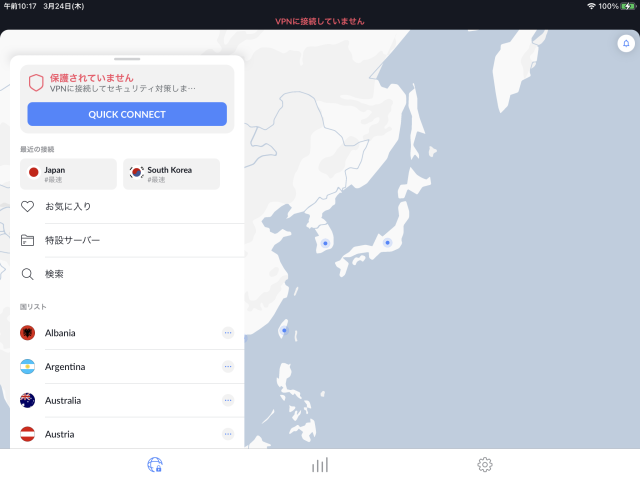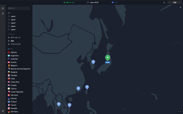一方、NordVPNはインストールして、起動して、日本を選択するだけです。