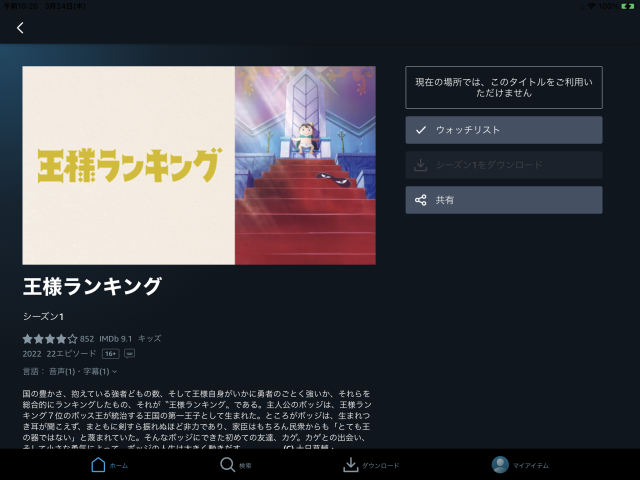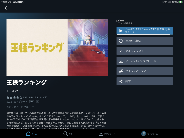 AmazonプライムにはNetflixにはないアニメ、例えば、人気の王様ランキングも観れます。(2025年9月)