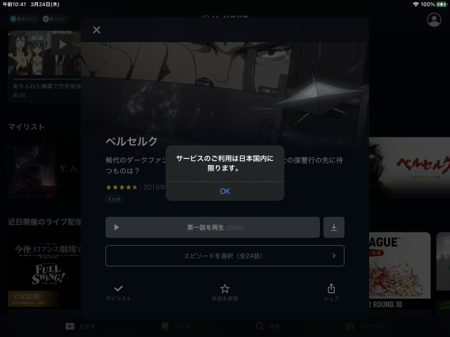タイトル一覧は表示されますが、観れるのは「海外でも視聴可能」のタイトルのみです。