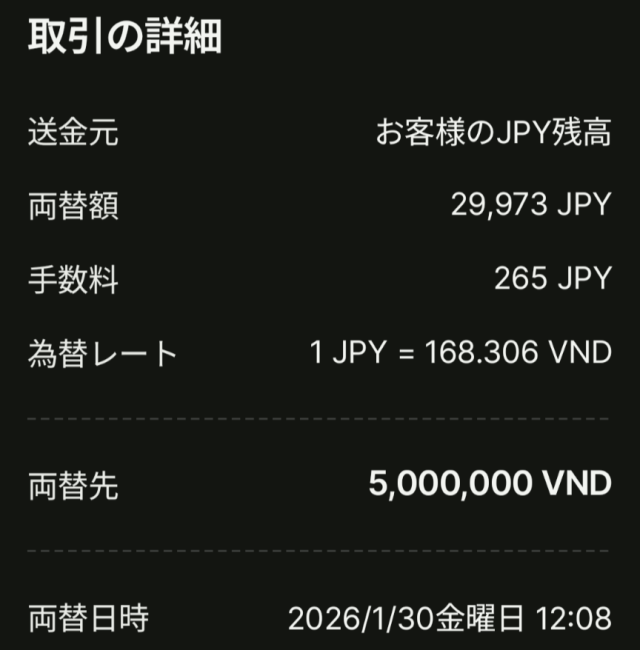 ちなみに、この500万VNDは少し円高だったタイミングに両替しているので、両替手数料を含め全ての手数料をチャラにできています。